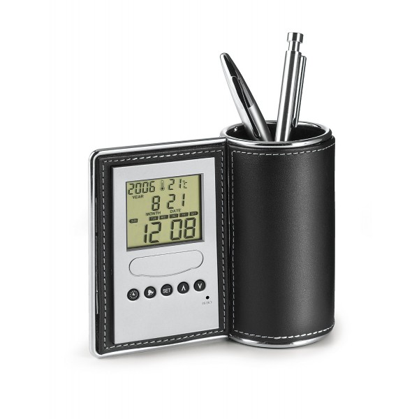 Suport pentru instrumente de scris cu: ceas cu alarma , calendar si termometru. Material plastic, imitatie piele, metal. Dimensiuni 12 x 6,5 x 14 cm, greutate 300g.