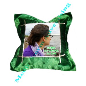 Perna din saten de culoare verde, ce se personalizeaza cu fotografia, textul(logoul) dvs. Se personalizeaza zona de pe fata pernei. Dimensiunea pernei 40 cm x 40 cm. Pretul include fata de perna, umputura si personalizarea. Este un cadou potrivit pentru copii, parinti, bunici.