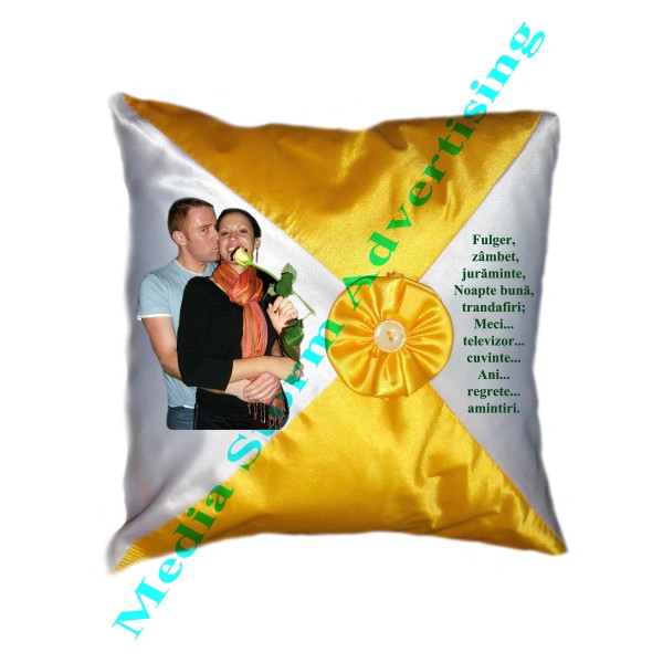Perna patrata din saten in doua culori galben si alb, ce are pe centrul ei un trandafir detasabil din saten de culoare galbena. Se personalizeaza cu fotografia, textul si/sau logo-ul dorit de dumneavoastra pe suprafata alba a pernei. Dimensiune perna 40cm x 40cm. Pretul include fata de perna, umplutura si personalizarea.