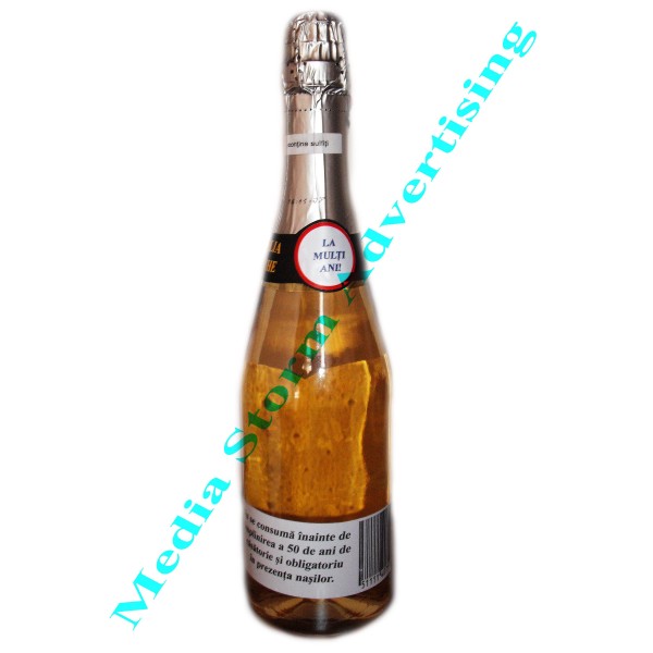 Se personalizeaza la comanda orice model de sticla. Se inlocuiesc etichetele originale cu etichetele dorite. Etichetele se personalizeaza cu textul si fotografiile dumneavoastra. Pretul este doar pentru personalizare si nu include contravaloarea sticlei si al continutului care se plateste peste pretul afisat pe site in functie de produsul pe care il doriti. La lansarea comenzii specificati preferintele dvs in legatura cu sortimentul de bautura pentru care optati (sampanie, vin, coniac etc.).
