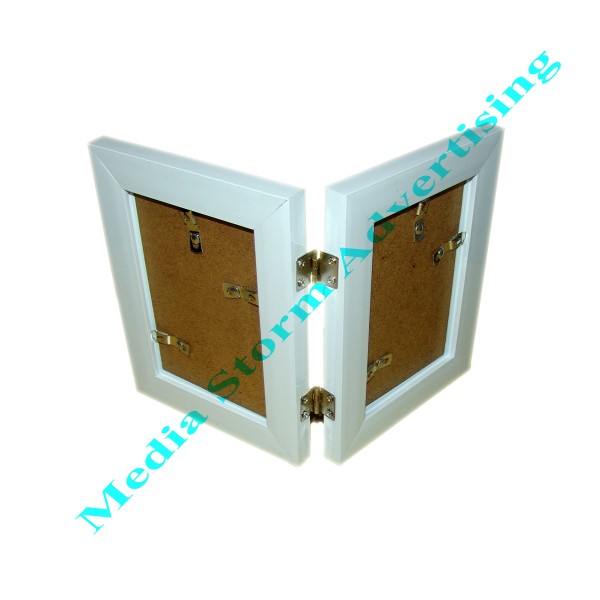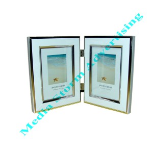 Rama foto alba cu margine argintie din material plastic cu doua parti prinse cu balamale metalice. Formatul pozelor care intra in rama este de 9 cm x 13 cm.