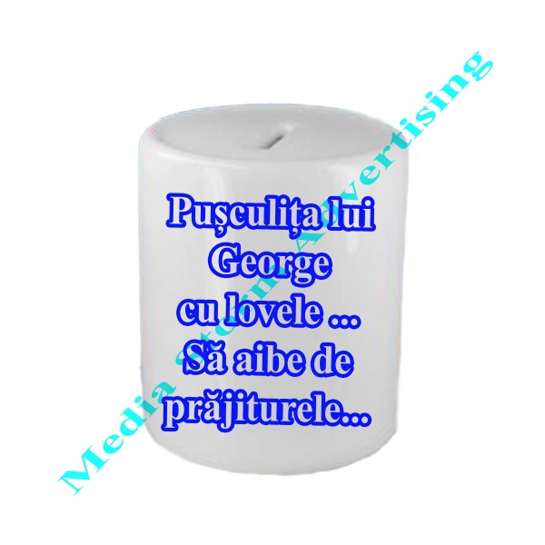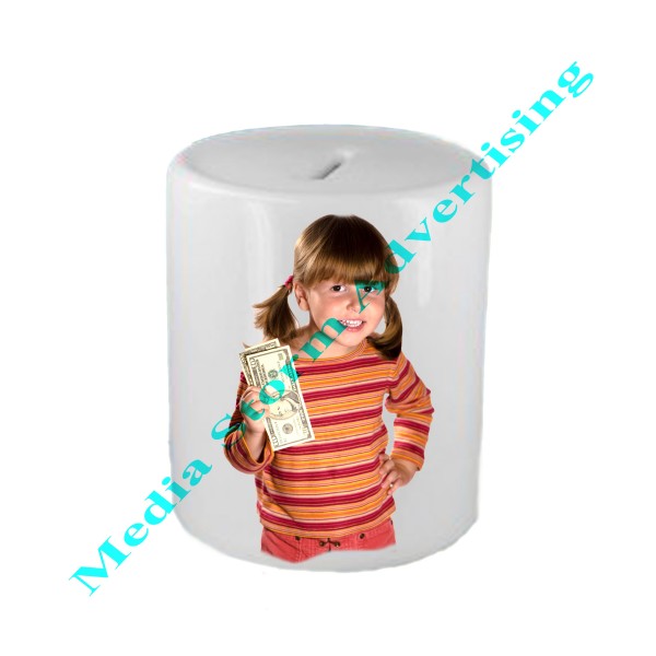 Pusculita de bani personalizata din material ceramic. Un cadou personalizat dedicat copiilor. Pusculita se personalizeaza cu fotografia copilului si/sau un text. Pretul afisat include si personalizarea.