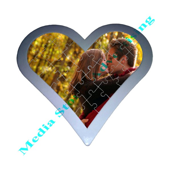 Puzzle personalizat din carton presat in forma de inima cu chenar alb. Se personalizeaza cu fotografia, textul si/sau logo-ul dorit de dumneavoastra. Numar de piese 27. Dimensiuni puzzle 19cm x 20cm. Pretul afisat include personalizarea.