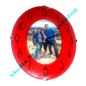 Ceas de perete personalizat cu fotografia textul si/sau logo-ul dorit de dumneavoastra. Ceasul este din material plastic de culoare rosie iar cadranul este din sticla. Dimensiunile ceasului personalizat sunt aproximativ 29 cm x 35 cm. Dimensiunea cadranului care se personalizeaza este de 22 cm x 16 cm. Ceasul dispune de mecanism silentios. Pretul afisat include si personalizarea. Un cadou ce poate fi oferit in orice imprejurare.