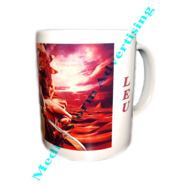 Cana ceramica alba personalizata cu fotografie ce reprezinta zodia leu. Se poate imprima la cerere un alt semn pentru zodia leu. Pretul include personalizarea.