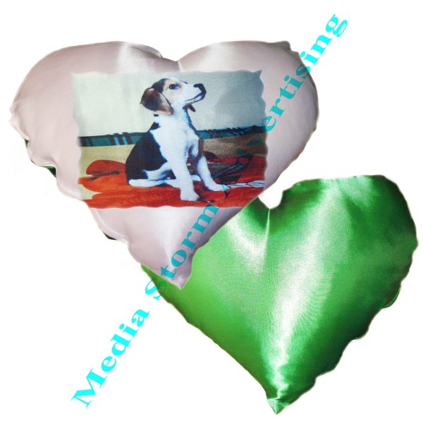 Cadou personalizat perna inima din saten, are o fata alba si una verde. Se imprima cu fotografie, text sau logo pe fata alba. Dimensiuni 45 x 45 cm. Pretul include fata de perna, umplutura si personalizarea. Imprimarea se face prin sublimare in materialul fetei de perna.Cadou pentru toate varstele.