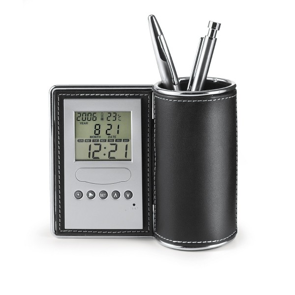 Suport pentru instrumente de scris cu: ceas cu alarma , calendar si termometru. Material plastic, imitatie piele, metal. Dimensiuni 12 x 6,5 x 14 cm, greutate 300g.