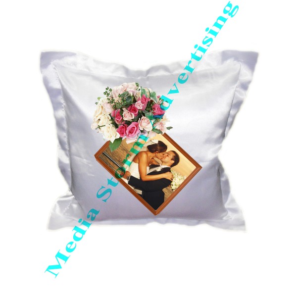 Perna personalizata patrata din saten alb. Dimensiuni 40cm x 40cm. Se personalizeaza pe fata cu fotografia, textul, logo-ul dorit de dumneavoastra. Pretul include personalizarea, fata de perna si umplutura.