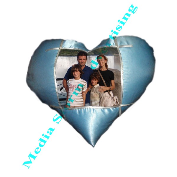 Perna personalizata in forma de inima din saten albastru deschis cu o zona patrata unde se imprima fotografia, textul dumneavoastra. Dimensiunile pernei: forma de inima incadrata in 45cm x 45cm. Un cadou deosebit de atractiv si practic in acelasi timp. Pretul afisat include fata de perna, umplutura si personalizarea.