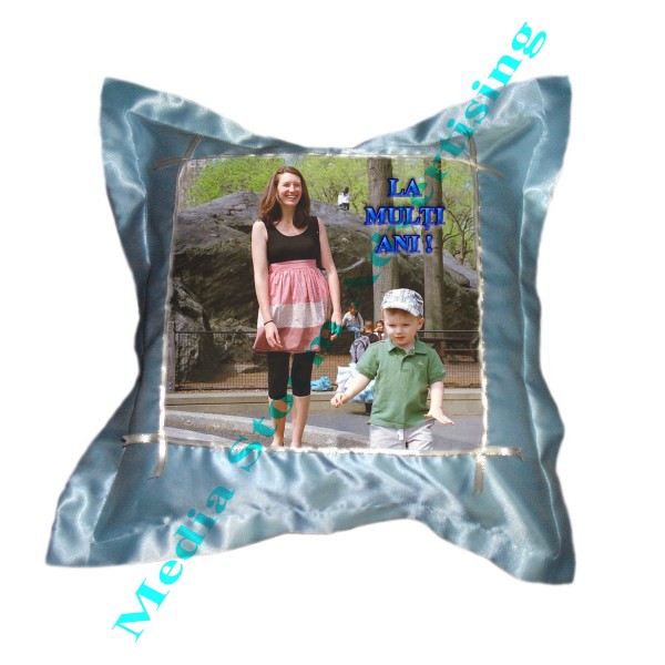 Perna personalizata din saten albastru. Se imprima pe fata pernei in zona patratului cu fotografia, textul sau logo-ul dorit de dumneavoastra. Dimensiuni perna 40cm x 40cm. Pretul include personalizarea, fata de perna si umplutura.