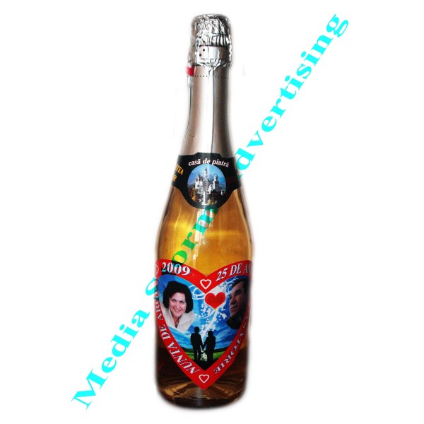 Se personalizeaza la comanda orice model de sticla. Se inlocuiesc etichetele originale cu etichetele dorite. Etichetele se personalizeaza cu textul si fotografiile dumneavoastra. Pretul este doar pentru personalizare si nu include contravaloarea sticlei si al continutului care se plateste peste pretul afisat pe site in functie de produsul pe care il doriti. La lansarea comenzii specificati preferintele dvs in legatura cu sortimentul de bautura pentru care optati (sampanie, vin, coniac etc.).