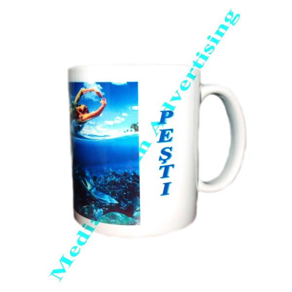 Cana din ceramica alba personalizata cu zodia PESTI. Se poate imprima si cu alta fotografie ce preprezinta semnul zodiacal pesti. Pretul include personalizarea canii.